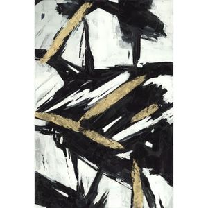 At Moe’s, we firmly believe that the home provides an environment of comfort and positivity. This belief is exemplified in the detail and care we give to our products. We strive to keep our stores warm and inviting; welcoming customers to come and nourish their desire for home décor. Bold sweeping lines of black, white and gold. Acrylic on canvas; comes with hooks, ready to hang.