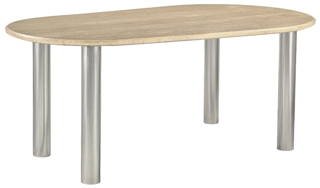 Unmistakably eye-catching, the Fia dining table makes a statement with a thin, beige, solid Italian travertine top with legs finished in shiny chrome for a polished, minimalist look. With a generous surface area, this table sets the tone with simplicity and elegance - an organized freeform creating a graceful juxtaposition with rectilinear space.Read More
