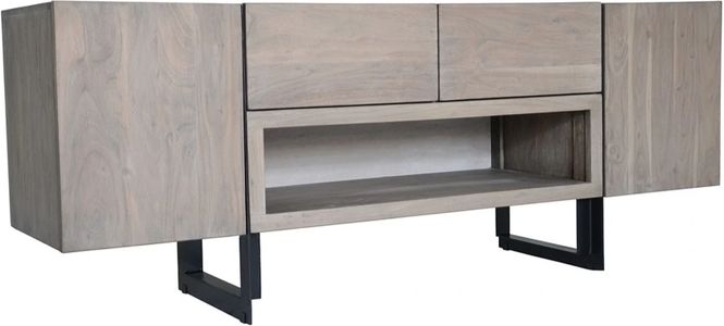 A contemporary entertainment cabinet with a transitional design for any decor. Featuring two large drawers, two doors with shelving, and an open compartment for audio-video components, this unit will keep your entertainment area neat. Crafted from solid wood and black, powder-coated iron for top-notch quality.Read More