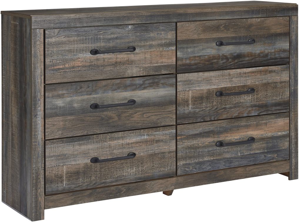 The ornate and sturdy Drystan 6 drawer dresser provides deep storage and rustic appeal with the brown wood finish, replicated grain, and industrial hardware.